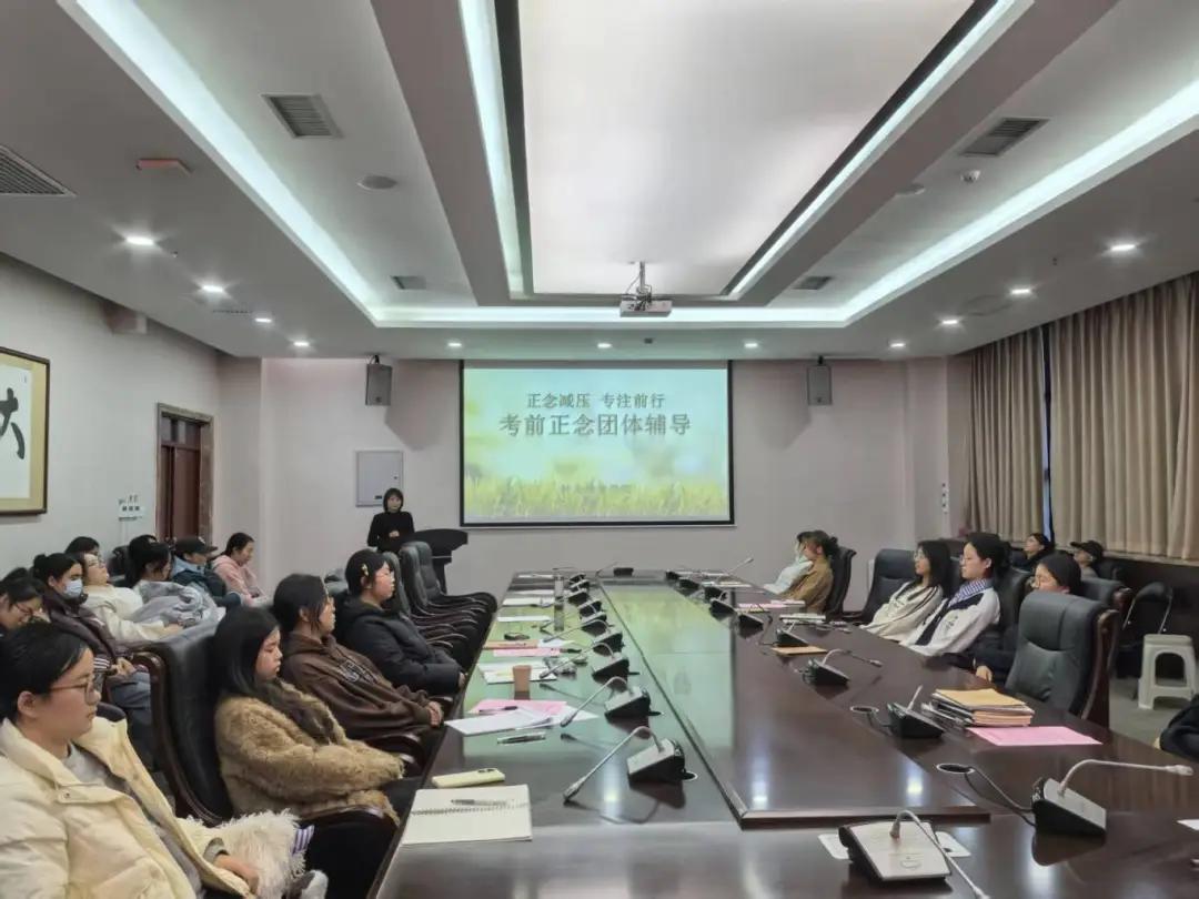 在第二阶段的心理释压环节,辅导员宋文佳带领学生开展“正念减压 专注前行”考前心理团体辅导。通过坐姿身体扫描的方法让学生正念冥想、正念呼吸、身心觉察,从而引导学生缓解紧张、焦虑情绪,提升专注力,以更加从容、自信的心态迎接期末考试。