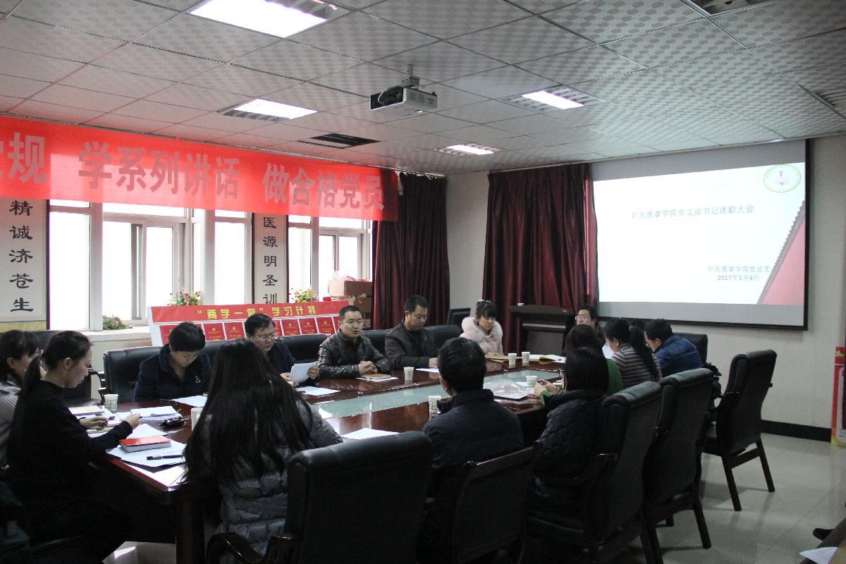 为了认真总结2016年工作,积极谋划2017年发展,我院按照学校党委安排于1月4日下午召开2016年度教职工考核大会。统战部副部长李战权、纪委监察处秘书华瑛、针灸推拿学院院长李永峰、党总支书记雷正权、党总支副书记兼副院长艾霞及全院28名教职工参加大会,会议由雷正权书记主持。