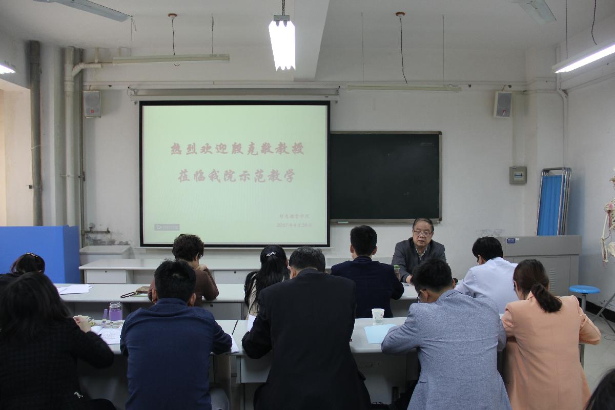 为提升学院教师授课水平、提高教师专业素养。学院于4月26日下午14:00邀请了省名老中医殷可敬教授示范教学。学院全体教职工参加了会议,会议由院长李永峰主持。