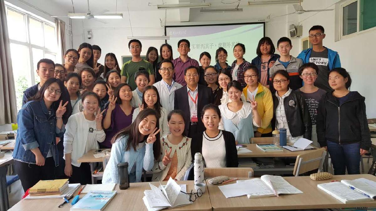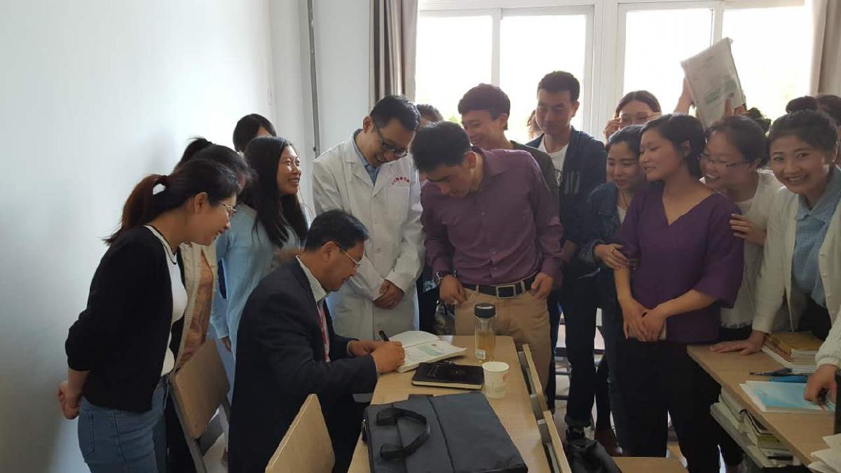 专家走访教室期间,我们看到这样热情温馨的一幕。当评估组副组长、山东中医药大学副校长高树中教授走进针推学院教室时,不少受其大作《一针疗法·灵枢诠用》影响的高教授的中医“粉丝”纷纷起立,有些“胆大”的学生在呼叫着“男神,男神!”的同时,不断争抢着要与高教授合影,并索要签名,及讨教中医学术问题,高教授不仅乐于亲近同学,更不厌其烦地解疑答惑。
