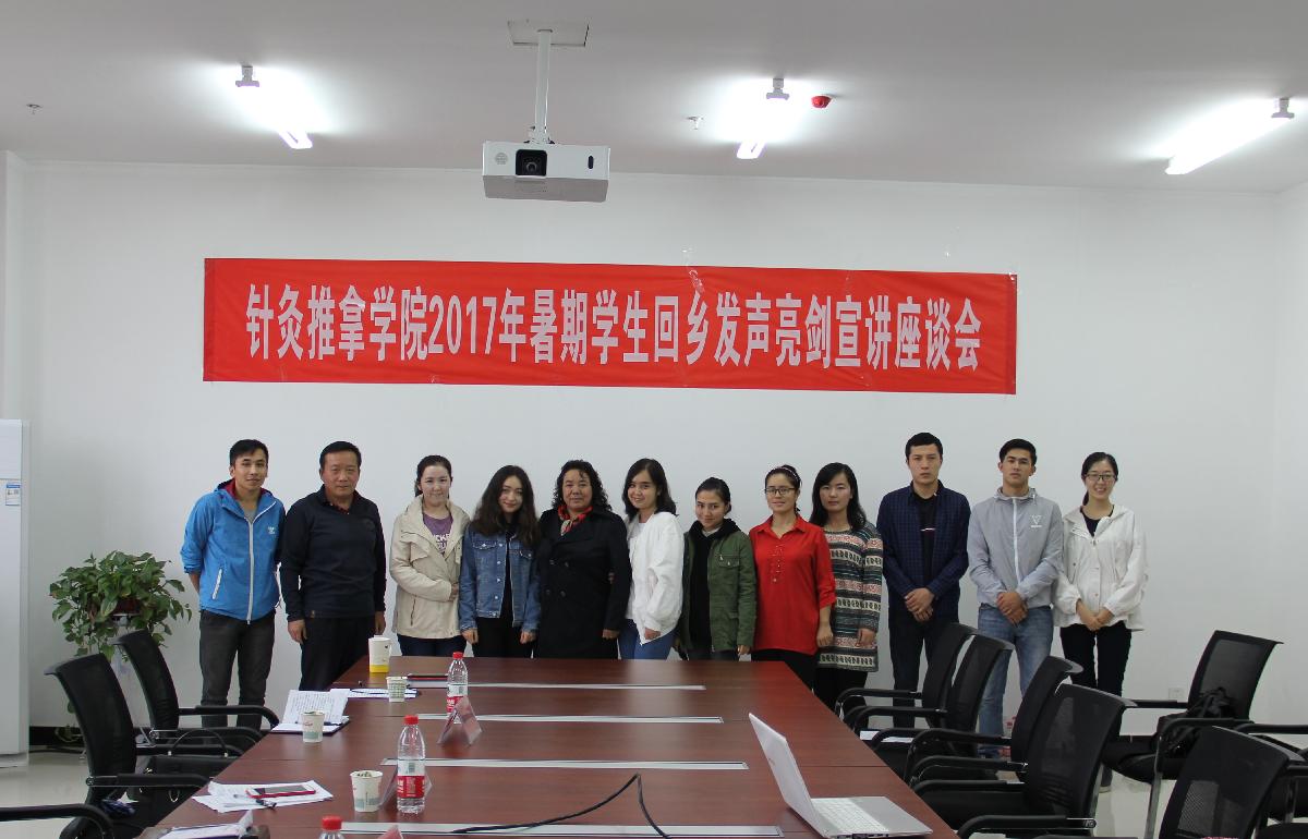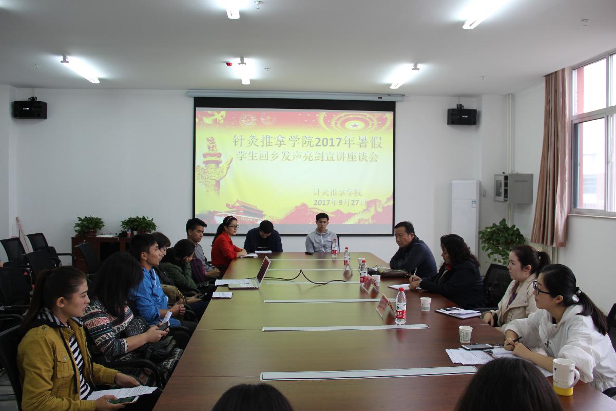 9月27日下午,我院于5505会议室召开了针灸推拿学院2017年暑期学生回乡发声亮剑宣讲座谈会。学工部少数民族管理干部门新和、祖力皮亚·阿不力孜、热依拉·艾山以及12名新疆籍学生参加了座谈会。会议由辅导员门元元主持。