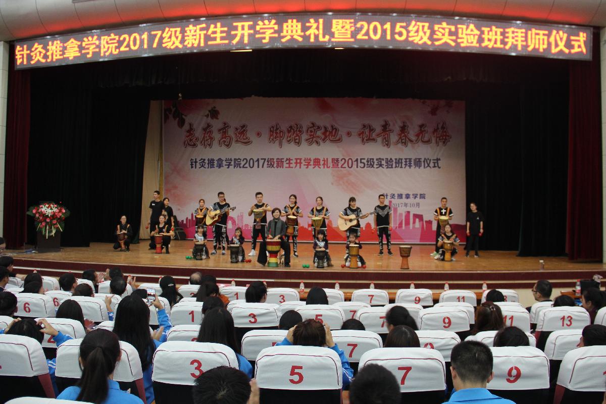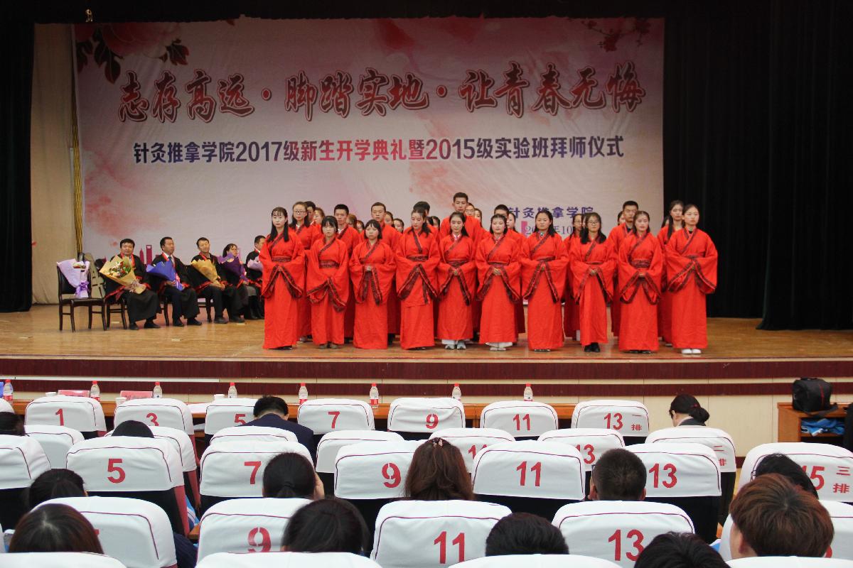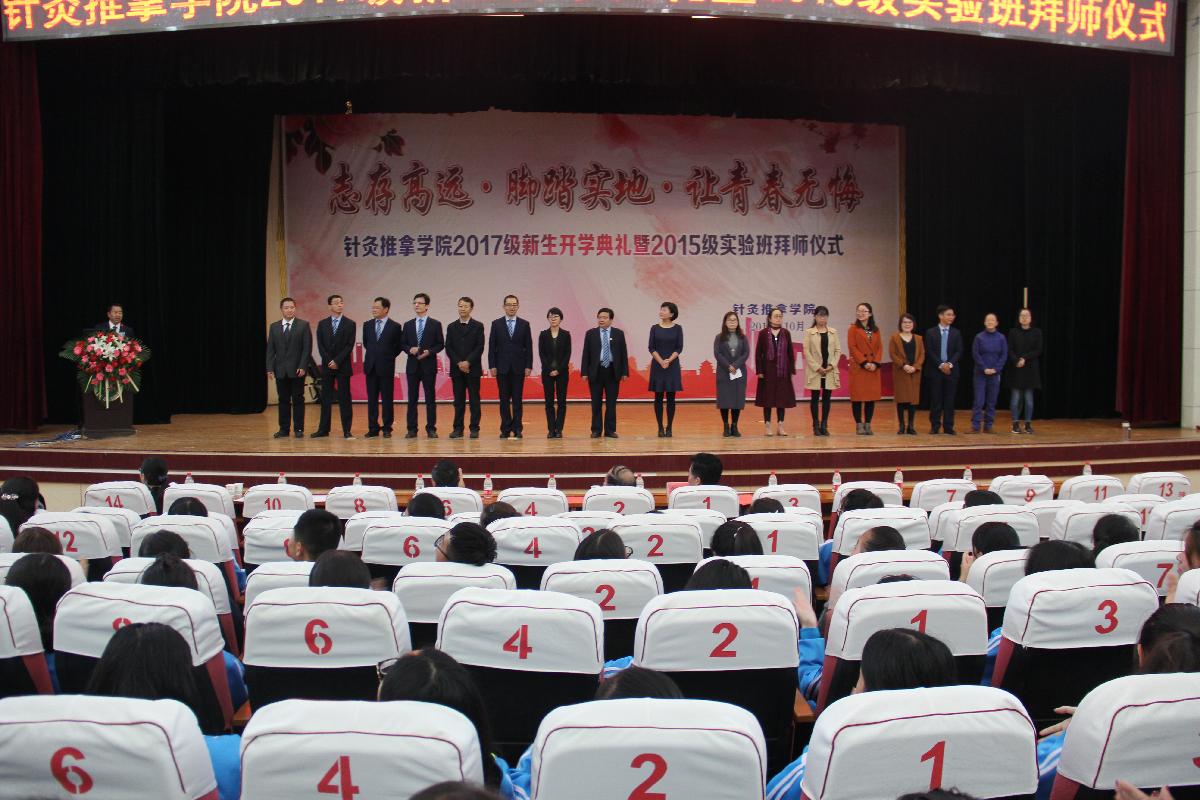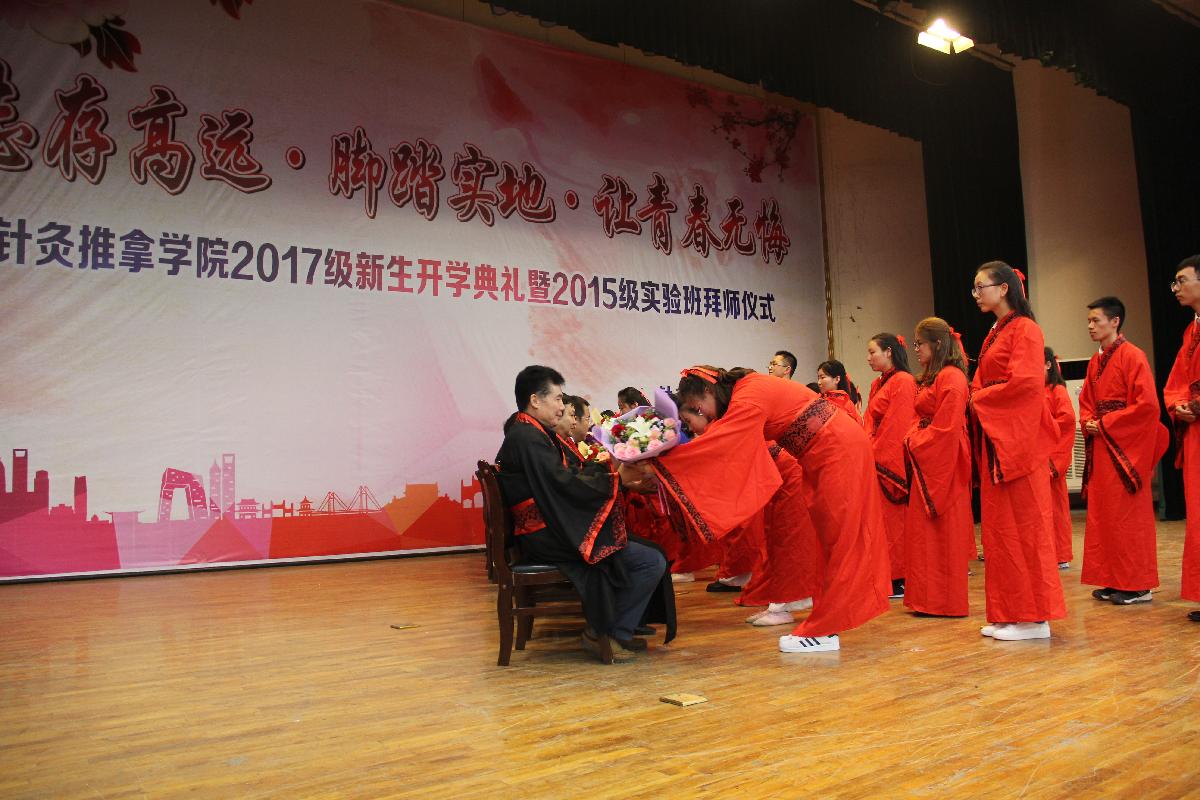 10月18日下午,针灸推拿学院在会展中心举办了以“志存高远,脚踏实地,让青春无悔”为主题的新生入学教育暨2015级实验班拜师仪式。国家级名老中医殷克敬、副校长刘智斌、院长李永峰、党总支书记雷正权、副院长兼副书记艾霞、全体教师及2015级实验班,2016级、2017级全体学生参会,此外特别邀请到西安明仁医药保健品有限责任公司马续斌总经理。大会由雷正权书记主持。