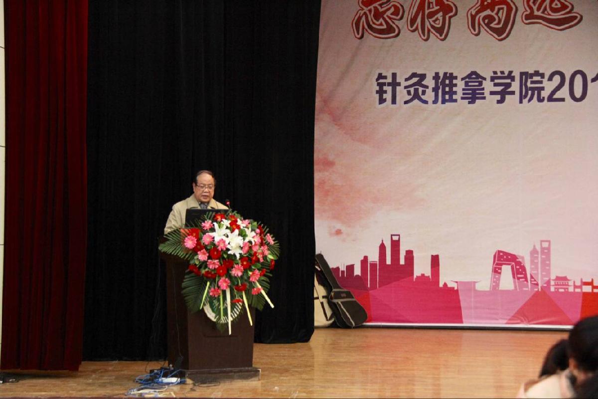 国家级名老中医殷克敬教授上台致辞,告诫同学们身为医学生要终生学习钻研,要脚踏实地,志存高远,改进方法,努力前行,继承与发展好我们的国粹。李永峰院长向新生们表示热烈祝贺,并表达了对于同学们的厚望,他希望同学们能够内外兼修,外正衣冠礼仪,内正品德,多读书,读好书,精读古籍,不耻下问,拓展自己的知识面,为终身献身医学做好准备,顽强拼搏,自强不息。教师代表刘奇发言,希望同学们能珍惜来之不易的学习环境,在校掌握好理论知识,在临床实践中日积月累,善于思考,掌握规律,顺利完成学业,为日后的工作打下夯实基础。随后15级实验班代表高佳、17级新生代表徐玮分别发言,表示会秉承“精诚仁朴”的校训,博学笃志,坚定不移地为了中医事业努力奋斗。