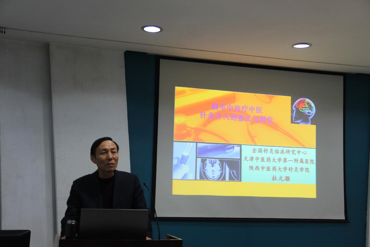 第一位专家是来自天津中医药大学的杜元灏教授,报告题目为《关于脑卒中的中医针灸介入的意义与研究》,他首先从脑卒中的概念分类以及西医治疗脑卒中的基本概况讲起,进而引出对西医治疗中一些困惑的思考,他认为基本治疗中重点过多的放在了血液性状上,而应该在血管上给予更多关注,他强调预防是重点,中药应用的价值在于改善血液状态,同时改善血管机能状态,而针灸是依靠机体自身调节对脑血管机能进行调节。同时他从科研角度,从微血管系统角度论证调节血管机能状态的重要意义。杜博士深入浅出的指出了针灸在脑卒中的治疗作用及意义,赢得了师生们热烈的掌声,会后同学们积极与杜博士就一些脑卒中相关问题进一步进行探讨。